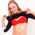 Das blonde Weib läst langsam die Klamotten fallen, bis sie nur mehr in der roten Unterwäsche da steht. Genüsslich legt sie sich auf das Ruhebett, wo sie den BH abstreift und wunderschöne sexy Titten zum Vorschein kommen, .